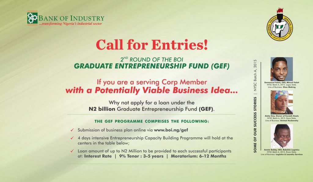 Apply for 2nd Edition Bank of Industry N2 Million Loan for NYSC Youth Corp Members.