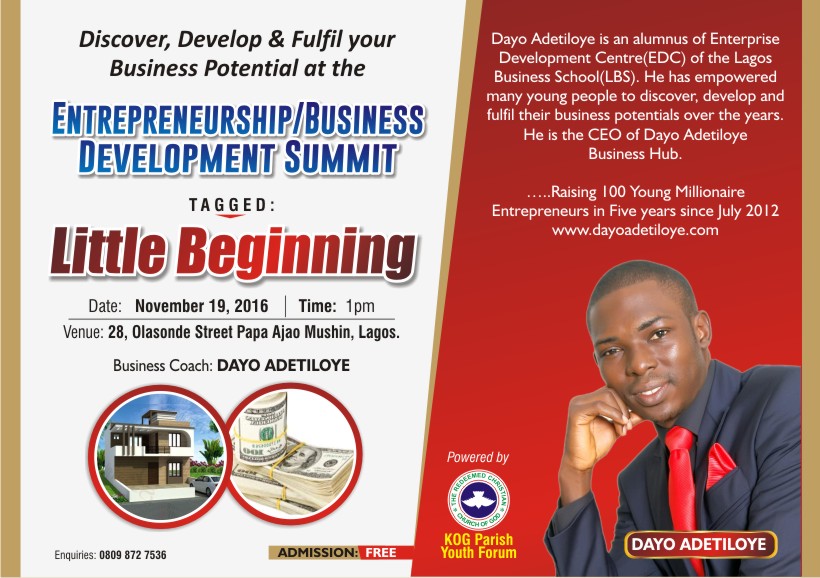 Dayo Adetiloye Speaking at RCCG KOG Business Summit 2016 Dayo Adetiloye Speaking at RCCG KOG Business Summit 2016 Dayo Adetiloye Speaking at RCCG KOG Business Summit 2016 Speaking inquiries Are you interested in booking a speaking engagement with Dayo Adetiloye? Kindly send an email to dayoadetiloye@gmail.com using the format given below or fill the […]