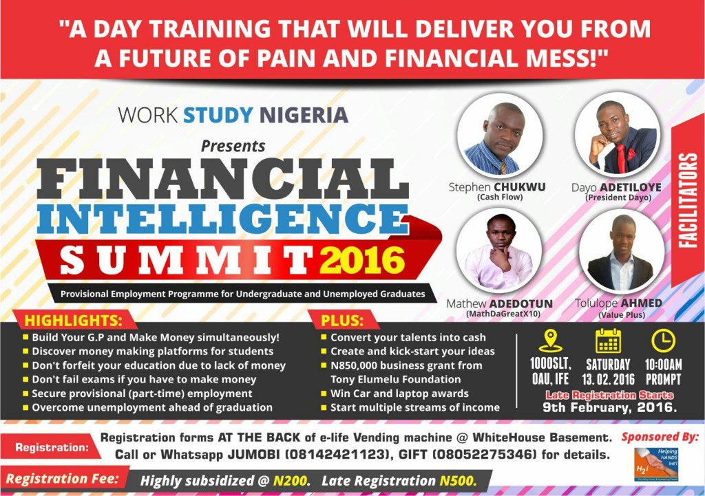 WorkStudy Nigeria Presents: FINANCIAL INTELLIGENCE SUMMIT 2016. Hi Good day! Please read this information carefully, it is meant to provide a viable solution to the ever disheartening employment conditions in Nigeria. It is no news that countless number of staffs are been laid off due to the falling prices of oil and […]