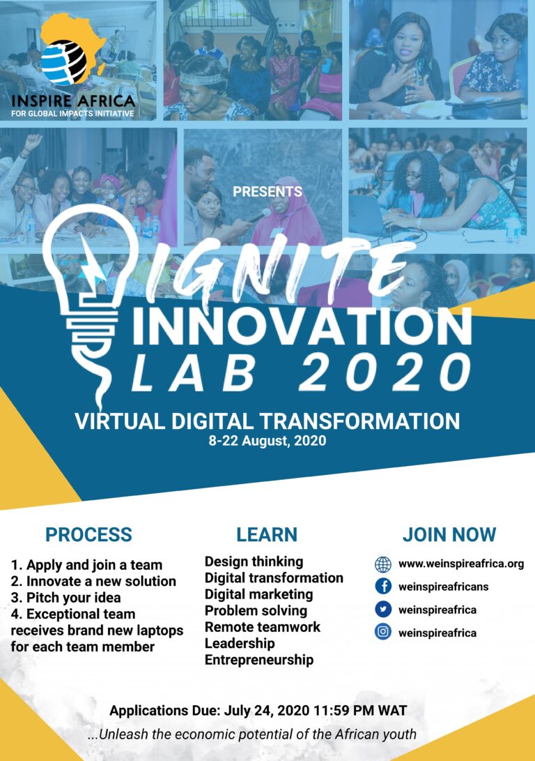 Apply for Ignite Innovation Lab (IGL) Digital Transformation for 19-28 years old and Win Laptops, Cash prices, Digital skills and Recognition. Closes July 24, 2020